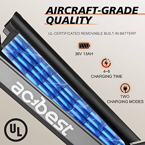 - Removable Built-in Aircraft-grade Quality Battery :The UL-certificated 36V 13AH battery is easy to remove for charging and has a waterproof, shockproof design,which is safer and lasts much longer than other Electric Bicycles. The battery only takes 4-6 hours to fully charge, giving you a range of up to 35 miles (throttle)/50 miles (PAS) on a single charge.