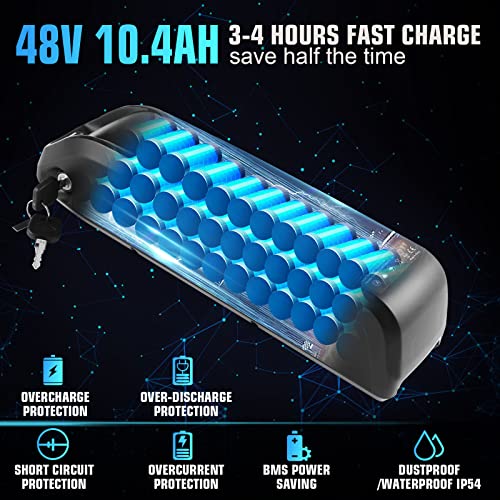 - â–º499WH LARGER CAPACITY FAST CHARGE BATTERY–Up to 26 miles per charge with the powerful 48V 10.4Ah battery. Plenty for a day’s adventure or most trips to work and back. The battery adopts the new fast charging technology and only costs you 3-4 hrs for a fully charge. It saves half of the charge time. You can charge on/off the ebike by your convenience. No worry for being stolen.