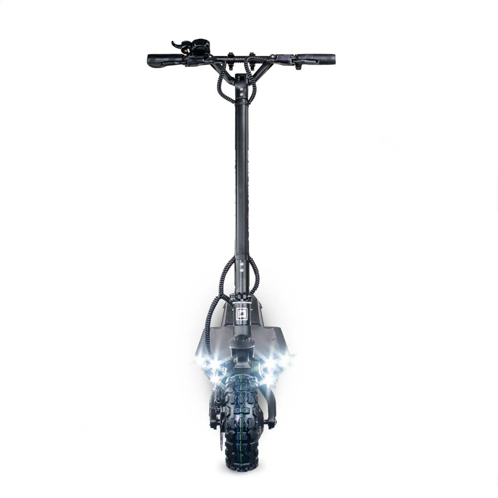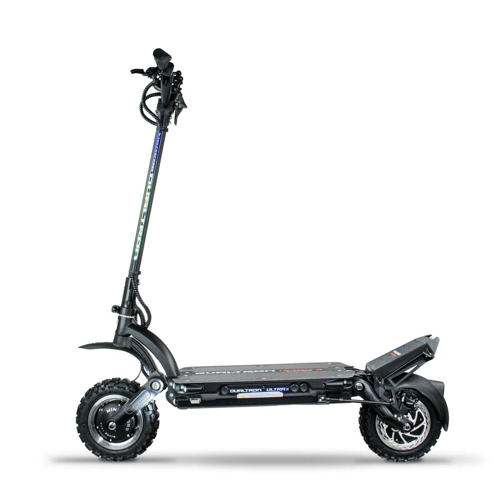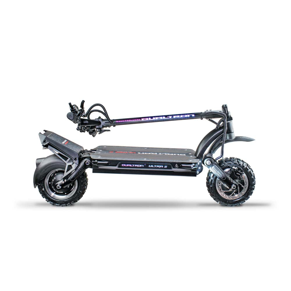 - Unleash the power of the Dualtron Ultra 2, the ultimate off-road electric scooter. Equipped with dual max 6640W motors, it reaches an impressive top speed of 56 mph. The redesigned footrest now houses the 40A controllers, ensuring better heat dissipation during longer rides. With a larger deck accommodating a massive 72V 35 Ah Samsung or LG battery, you can enjoy an extended range of up to 64 miles. The cockpit features an EY3 LCD trigger throttle, light and eco/turbo buttons, and folding handlebars for added convenience. With dual hydraulic brakes for smooth and reliable braking, the Ultra 2 provides an enhanced riding experience. Its sturdy aviation aluminum frame and exceptional torque make it a formidable ride for those seeking power and performance. Get ready to conquer any terrain with the Dualtron Ultra 2.11” x 3.5″ ultra wide knobby off-road tires, front rubber suspension, and adjustable rear rubber suspension reduces the rebound and absorbs small bumps when riding on any terrain