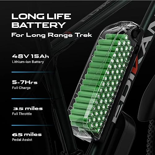 - 【LARGE CAPACITY LONGLIFT BATTERY】Experience the thrill of the EDIKANI ultimate electric mountain bike! Equipped with a powerful 48V 15AH battery, offers a long range of up to 35 miles in full electric mode and 65 miles in pedal assist mode(depending on rider weight and road conditions). The battery is lockable, removable and IP67 waterproof, can be charged indoor or outdoor, making it easy to take with you to the office or home. Perfect for both mountain adventures and daily commutes.