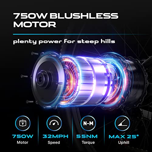 - 【750W MOTOR FOR STEEP HILLS】Built in750W powerful high-speed brushless motor, reach top speed of 32 mph. The brushless motor technology increases lifespan by 300%, output power by 75%, reduces energy consumption by 50% compared to other Mountain EBike motors that use brushed pure copper motors. Choose this road bike, made with durable materials and a powerful brushless motor, for daily commuting or off-road riding.