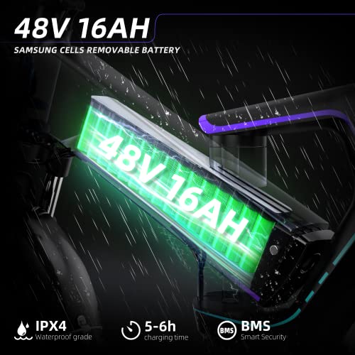 - 【SAMSUNG Cells Large Capacity Battery】Folding Electric bike comes with powerful 48V 16Ah Removable Samsung Cells battery that up to 40+ miles per charge. Enough for a day of adventure or most commutes and work. Two charging methods, charge on the bike or remove the battery to charge, with battery lock, no worry about theft.