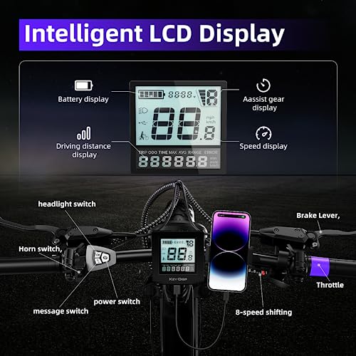 - 【Top-notch Accessories】Featuring a lightweight magnesium alloy frame, the e bike for adults offer durability and convenience. A lockable suspension fork ensures a smooth ride, while the LED headlight enhances night-riding safety. The LCD display shows speed, battery level, total mileage, and power assist level, and even supports USB charging. A robust rear rack provides ample storage for your essentials.