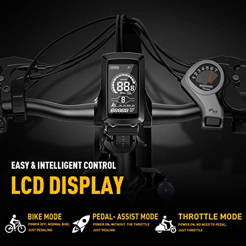 - EXCELLENT RIDING PERFORMANCE– Customize your ride performance with 3 riding modes and Shimano 7-speed gears. The perfect dual disc brakes and lighting system fully protect your safety.