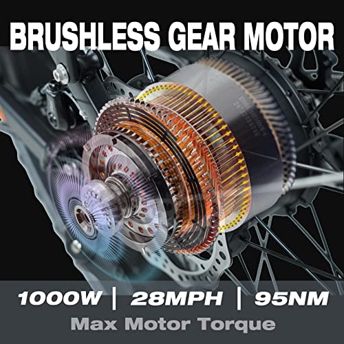 - HIGH POWER 1000W BRUSHLESS MOTOR: Our SENADA electric bike adopts powerful 1000W brushless Geared Hub motor with maximum speed up to 28MPH. 95Nm of torque fully satisfies your riding in all terrains. With a strong drive in process of accelerating and climbing, our electric bike for adults will bring you an unparalleled off-road cycling experience and safe rides whether in snow, beach, mountain or city roads.