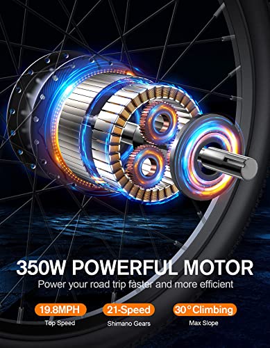 - POWERFUL 350W MOTOR & WHEELS: This 26” electric bike is equipped with powerful 350W motor, helping riders reach a top speed of 19.8mph. The riding range is 28-30 miles in pure electric bike mode and 50-60miles in pure assisted bike mode. It is very suitable for daily commuting and exercising. Strong wheels and motor allow you to face all kinds of terrain with ease. You don’t have to worry about the traffic jams, which makes your commuting much easier.