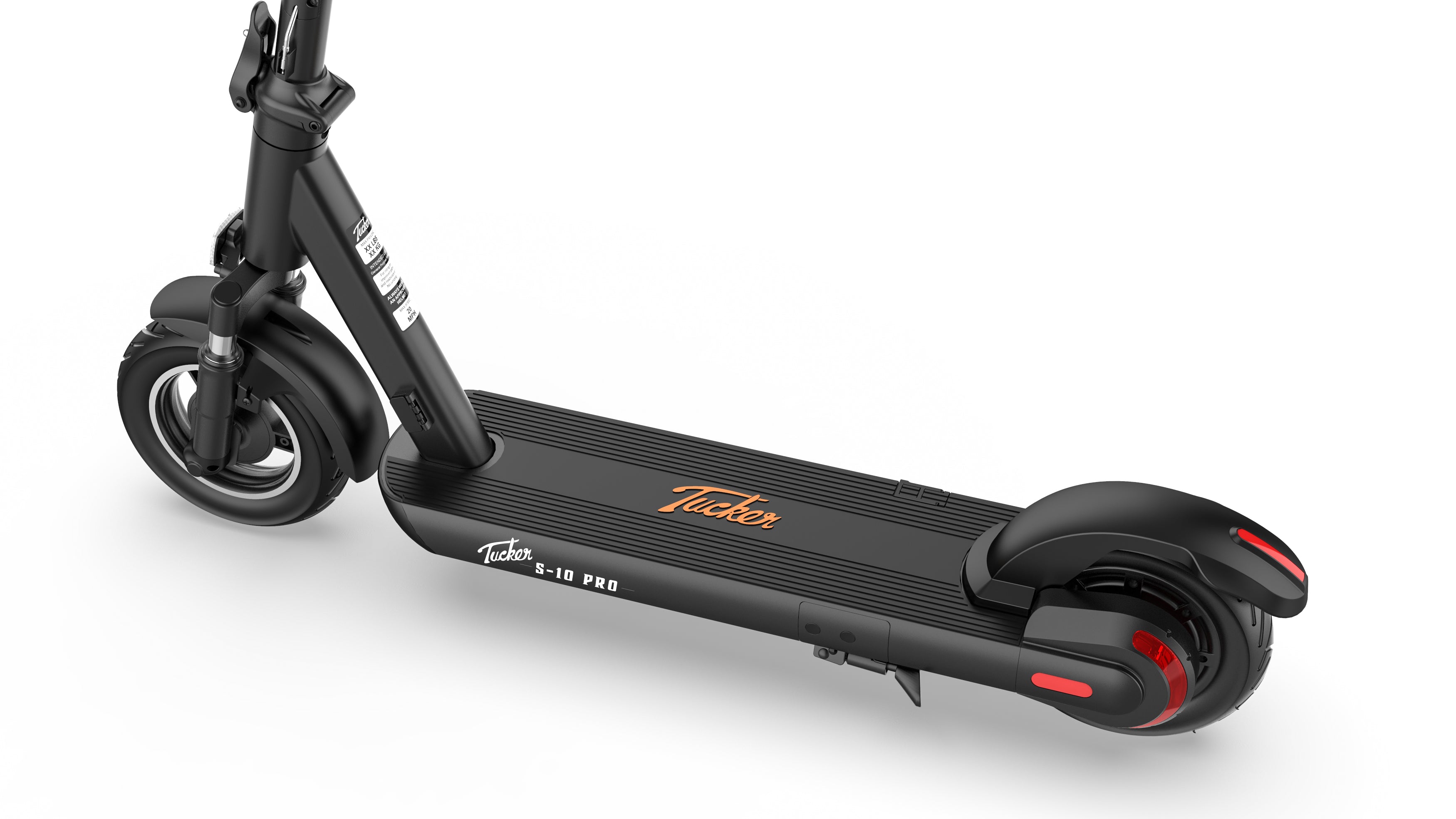 The Tucker S10-PRO, 500w electric scooter is designed to be your daily driver. With commercial grade construction, 13Ah battery with up to 30+ mile range, NFC card enabled lock and unlock, as well as an integrated combination lock, the Tucker S10-PRO is built to meet your needs.  Safety focused: Integrated LED front light, turn signals, and brake lights.  IP65 water resistants.  Large 10 inch wheels with dual front shock absorbers and a reinforced riding deck for a stable and secure ride.  A 500w motor, with max peak power as high as 600w, you can climb hills up to an impressive 30% grade with confidence. This is truly a commercial grade scooter, and certainly not a light-weight toy variant.  The 45 Lb weight provides a very stable platform, and allows for the high battery capacity and dual front suspension.  The larger 10” wheels allow for a comfortable and frankly safer ride. The scooter’s ability to quickly fold allows for convenient storage and can enable easy transportation in a trunk or on a bus.