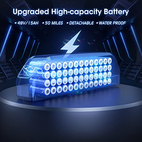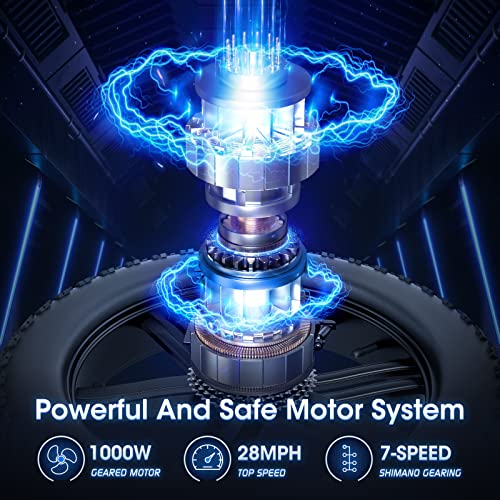 - Strong Power: Equipped with a 1000W high-speed brushless motor combined with 56Nm torque, this adult battery e-bike provides impressive hill-climbing power and a top speed of 28mph, perfect for a variety of terrains such as snow, beaches, mountains, and city roads. The adult mountain bike electric bicycle kit includes ultra-bright LED headlights and a 2W power, 80 lux turn light, and a backlit LCD HD display (with USB charging port) for ease of riding.