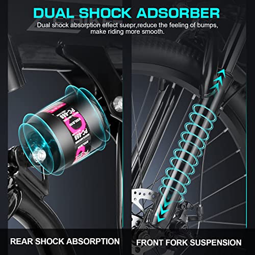 - 【Dual Shock Absorber & Dual Disc Brakes 】 The electric mountain bike comes standard with puncture resistant tires, dual shock absorber and dual disc brakes ensure a shorter braking distance and your driving safety.