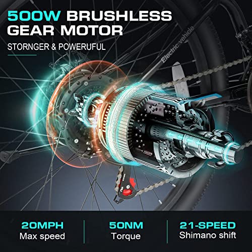 - 【500W Powerful Brushless Motor】 – Intelligence, efficient and safety are its core specials among ebikes. The stronger brushless motor of ebike with lower no-load current, provides enough power for your daily travel and experience. Equipped with a 3-level power assist and SHIMANO 21 speed gears, your riding become responsive at any time and satisfies your every acceleration.