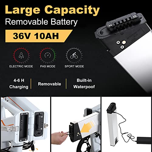 - 【Large Capacity Removable Battery】 The 36V/10AH battery supports 40km/25miles ( throttle power mode ) to 65km/40miles ( pedal-assist Mode ) ridding, plenty for a day’s adventure or most trips to travel and back or commute. And equipped with smart lithium battery charger, fast charging only need 4-6 hours. Remove the battery with the key and charging it at your home or office conveniently.